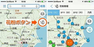 ≫  予報はありがたいな。「花粉情報は、アプリ版であれば、地図上に表示される『花粉ボタン』をタップすると表示」。