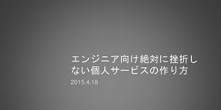 エンシ?ニア向け絶対に挫折しない個人サーヒ?スの作り方|slideshare マーケティング X Bluesky Facebook LinkedIn 2015/04/20 エンシ?ニア向け絶対に挫折しない個人サーヒ?スの作り方|slideshare ≫ エンジニアじゃなくても響く内容。「一人で個人サービスを作ろうとすると、途中で飽きちゃったり、技術で詰まっちゃたりして、作りきれないことよくありますよね」。