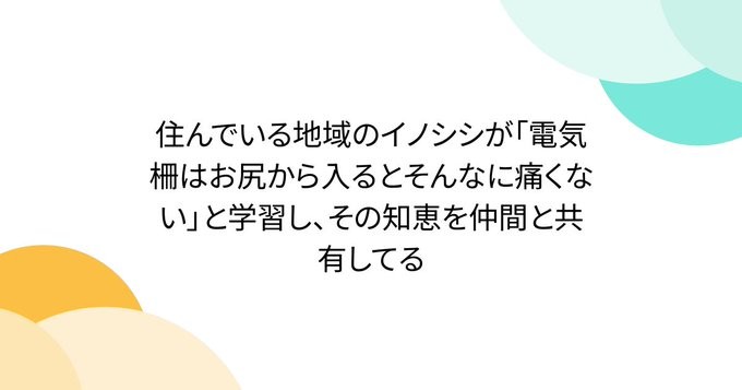 住んでいる地域のイノシシが「電気柵はお尻から入るとそんなに痛くない」と学習し、その知恵を仲間と共有してる – Togetter ウェブトレンド X Bluesky Facebook LinkedIn 2026/04/22 住んでいる地域のイノシシが「電気柵はお尻から入るとそんなに痛くない」と学習し、その知恵を仲間と共有してる – Togetter « こういう知見に触れられるのはありがたいです。「それがどうやら親子、親戚一同で情報共有されているみたいでお尻から入る猪が量産されました」。