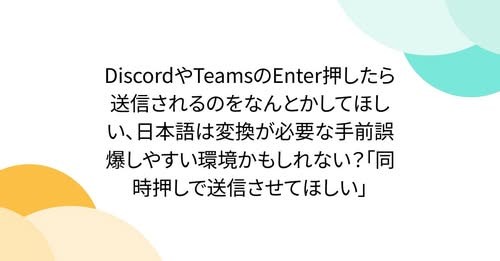 ウェブトレンド DiscordやTeamsのEnter押したら送信されるのをなんとかしてほしい、日本語は変換が必要な手前誤爆しやすい環境かもしれない?「同時押しで送信させてほしい」 – Togetter naonews 12月 15, 2025